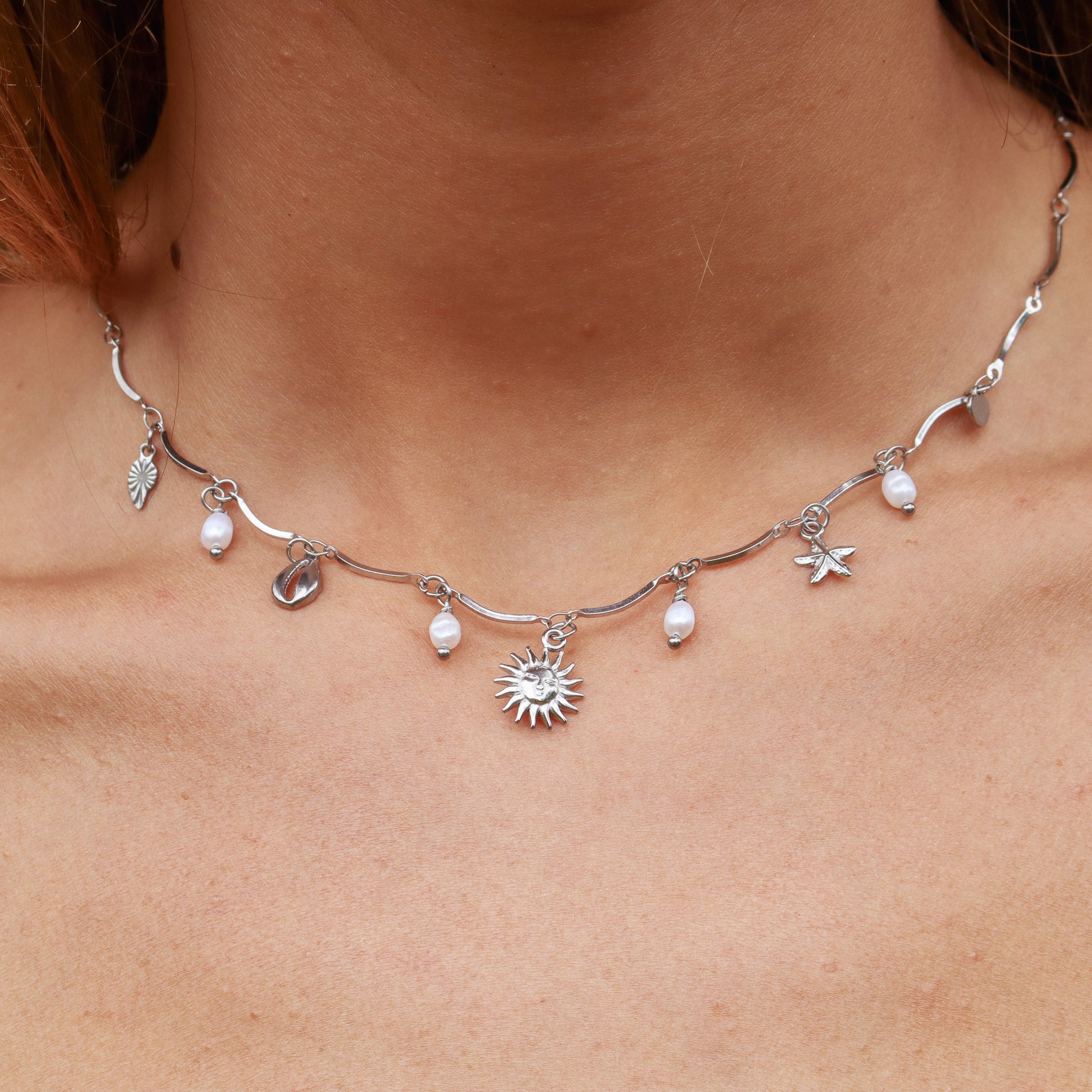 Sun-inspired and full of meaning — this silver multicharm choker features delicate beach charms and a natural sweetwater pearl. A playful everyday piece with soft ocean energy and timeless shine.